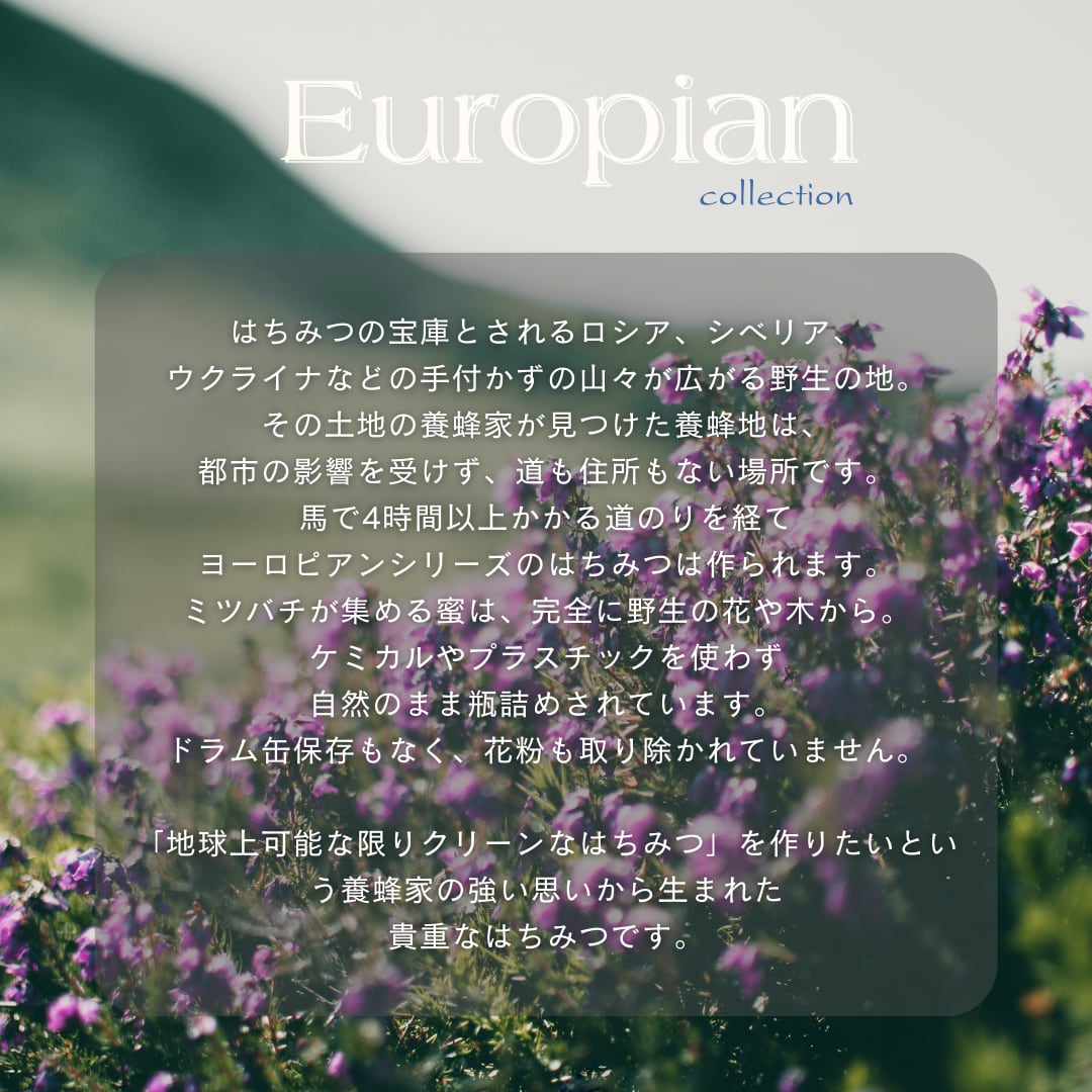 はちみつの最高の宝庫と呼ばれているロシア、シベリア、ウクライナ、そしてヨーロッパを跨ぐ、手付かずの 山々が並ぶ野生の地があります。